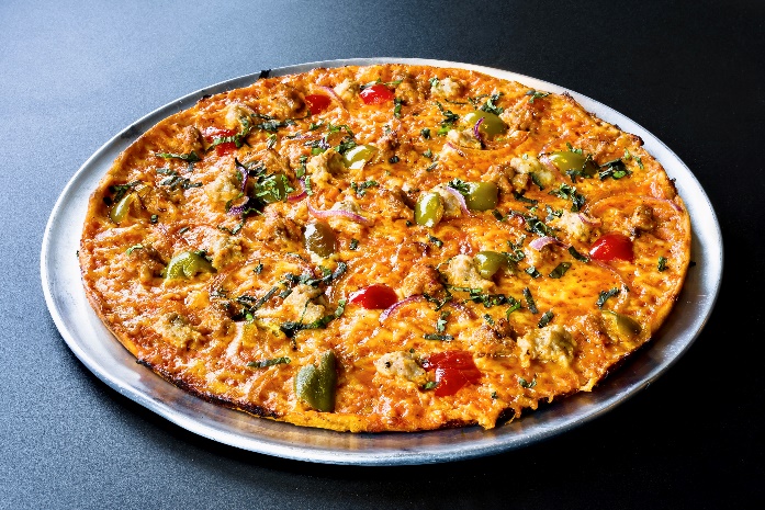 The Riko’s Scarpariello Pizza features blended mozzarella topped with chicken sausage, spicy sausage, tangy hot cherry peppers, and thinly sliced red onions. The pie is finished with a drizzle of Riko’s hot oil and fresh chopped basil.